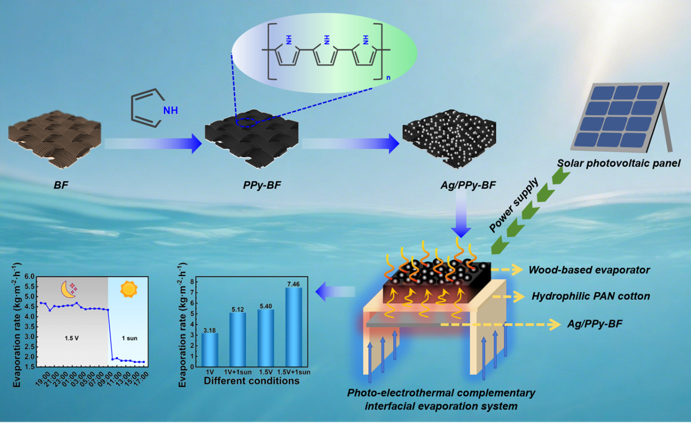 现在,全球淡水资源短缺问题日益严峻,高盐水(如海水、苦咸水、湖水)淡化技术的突破成为迫切需求。传统太阳能界面蒸发技术受昼夜光照波动和高盐环境下易结晶堵塞等问题限制。针对这些瓶颈,中国科研实验室新疆理化技术研究所能源化工研究中心分离材料与技术研究团创新性地将太阳能界面蒸发与低电压焦耳加热相结合,构建了“光-电-热”三位一体的界面蒸发系统(P-ECIES),突破了传统技术对光照条件的依赖。